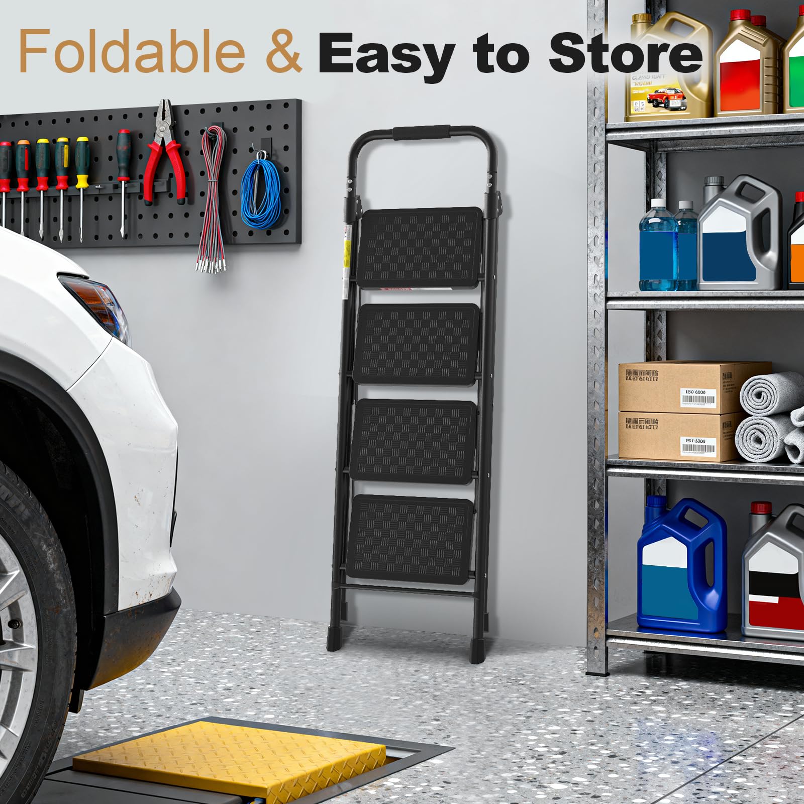 4 Step Ladder, Folding Step Stool with Wide Anti-Slip Pedal, Step Stool Foldable with Cushioned Handle for Home and Kitchen, Black