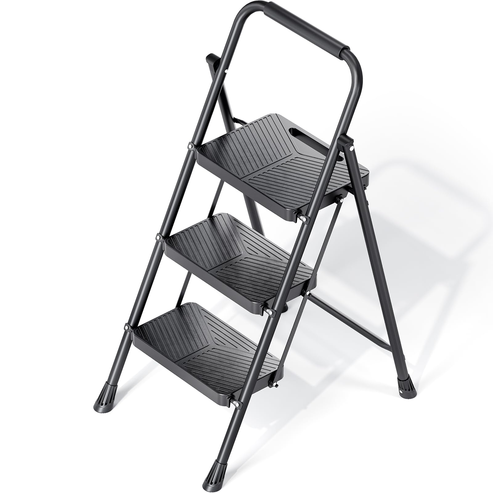 Folding 3 Step Ladder, Portable Ladder for Multi-Purpose, Home, Kitchen, Heavy Sturdy Steel Step Stool with Anti-Slip Wide Pedals, Handrail, Safe-Lock Design, Pass 500lbs Load Testing, Black