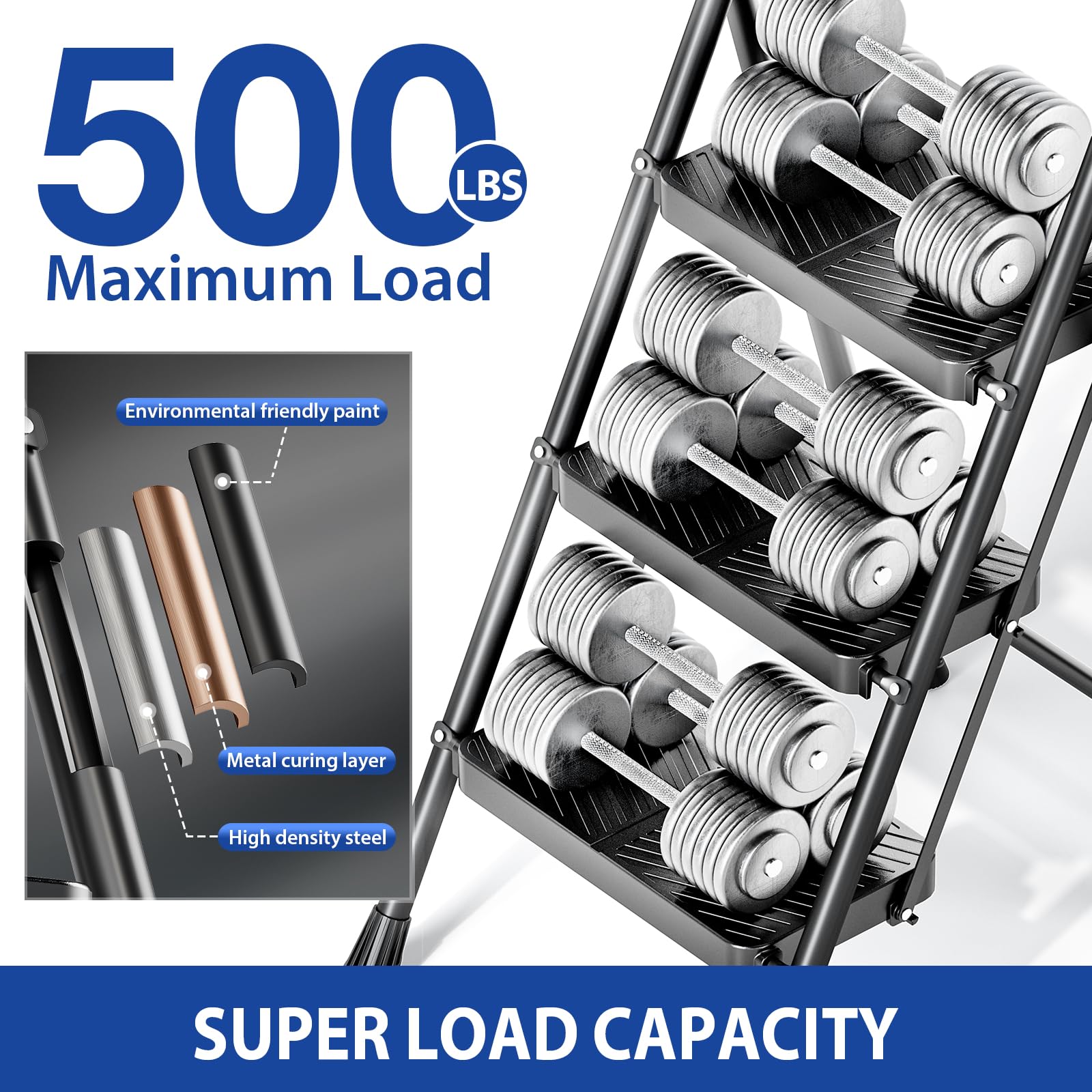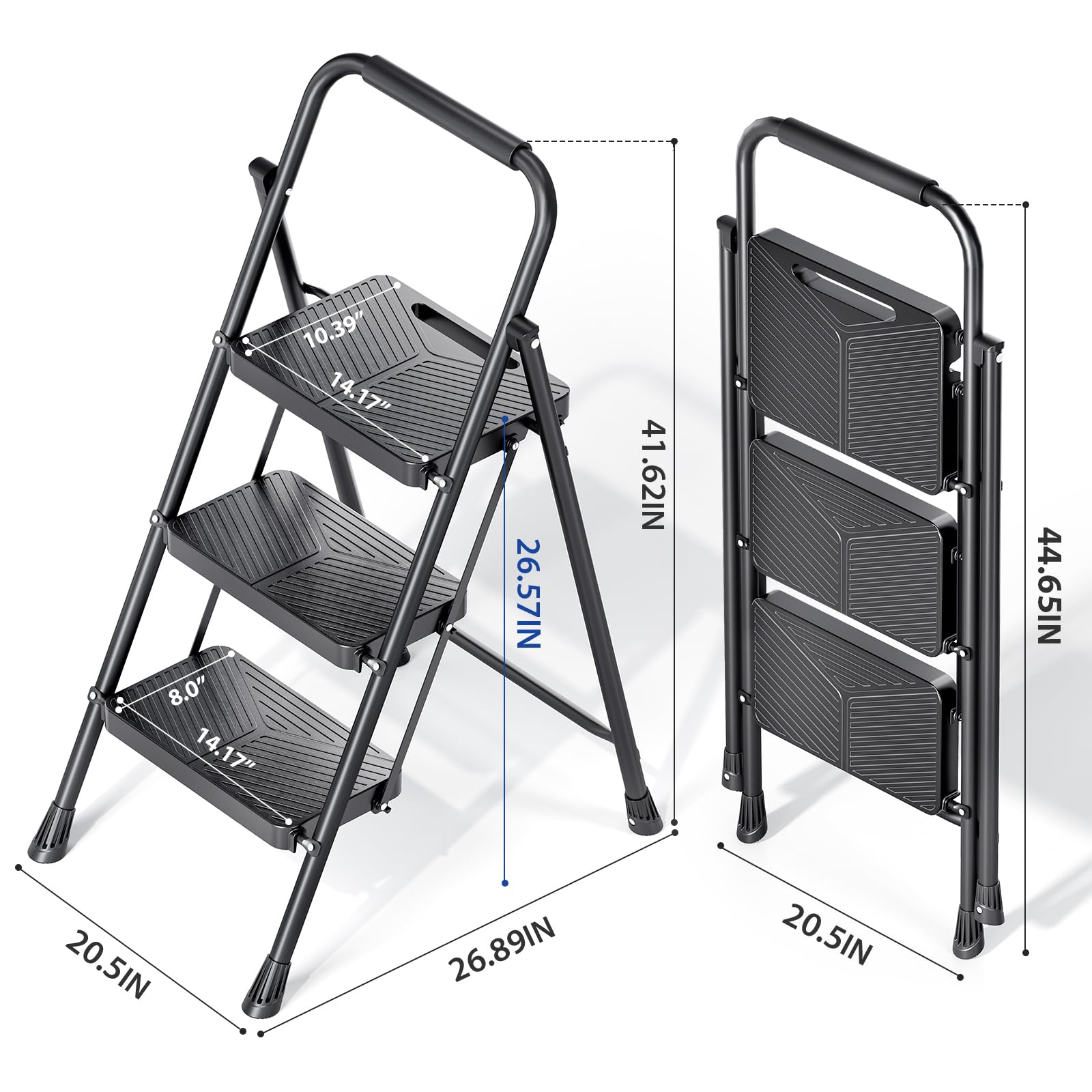 - Upgrade Step Ladder: Folding Step Ladder comes assembled and measures 20.51"L x 26.89"W x 41.61"H when open and 20.51"L x 2.64"Wx 44.65"H when folded. Maximum Load: 500 pounds