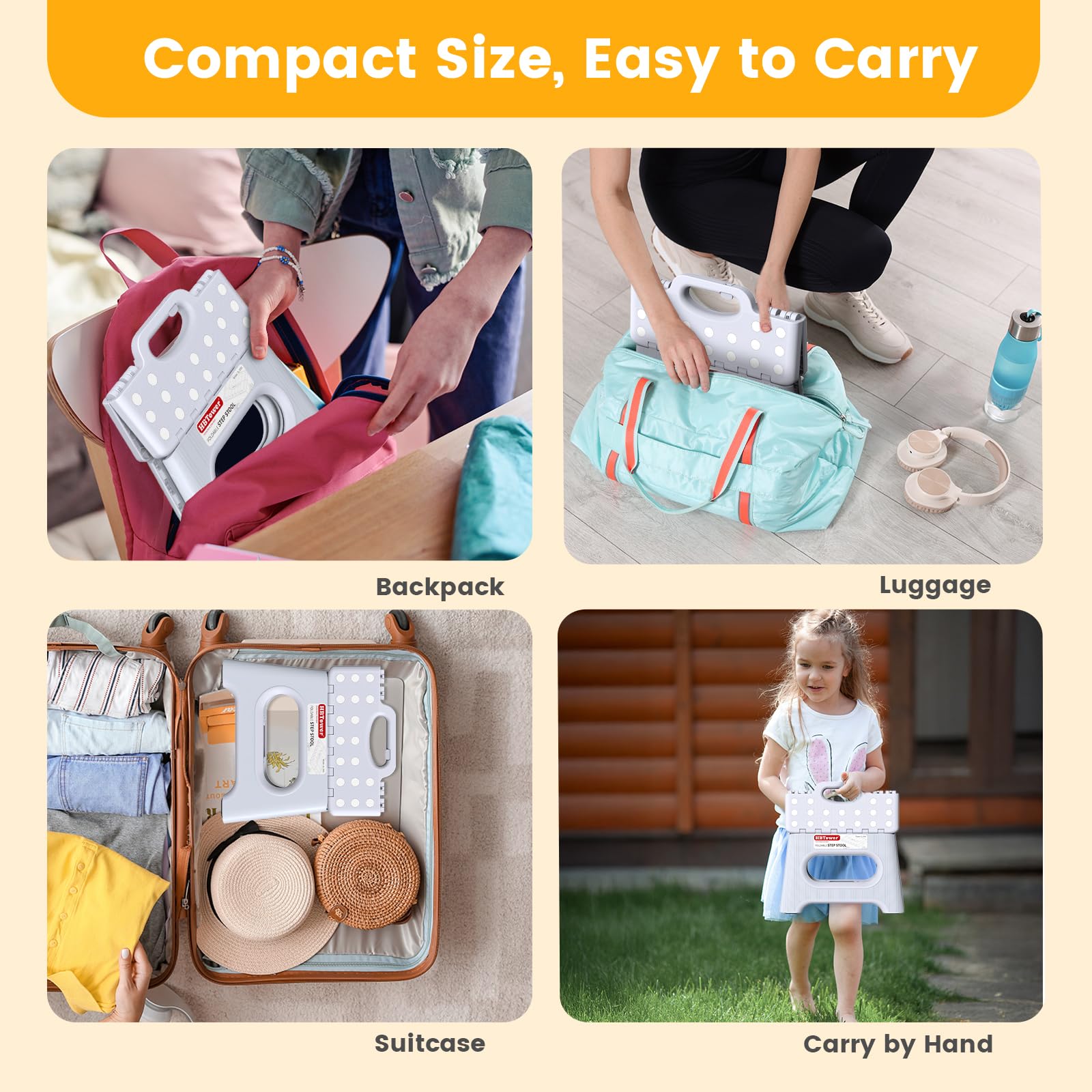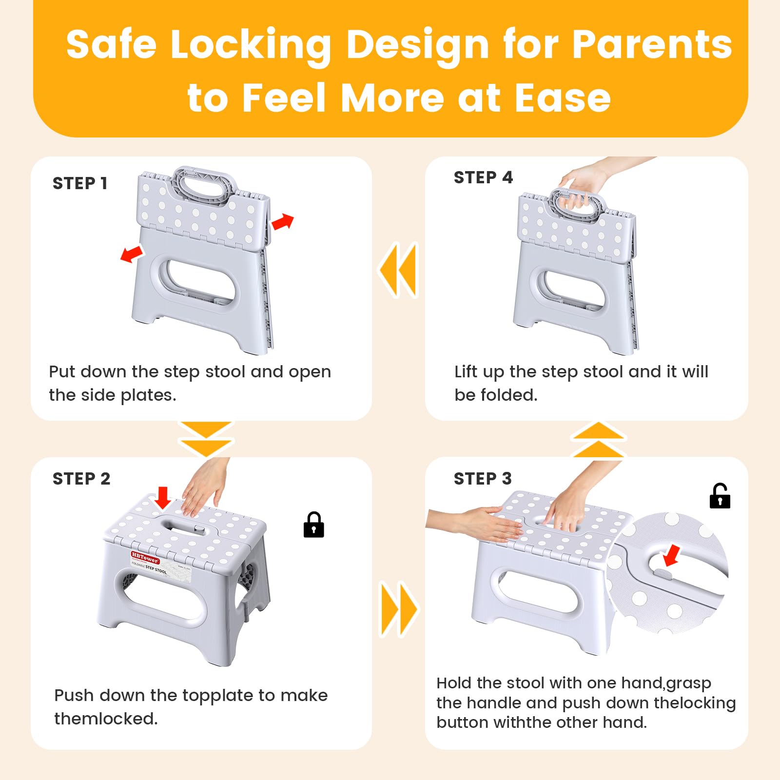 - 【Ergonomic Handle with Secure Portability】Our step stool features an innovative ergonomic handle, meticulously crafted for effortless folding and convenient carrying. enabling you to carry the stool comfortably and place it wherever needed, Equipped with a special anti - pinch buckle switch, Allows you to easily fold stools to avoid eliminating the risk of pinching.
