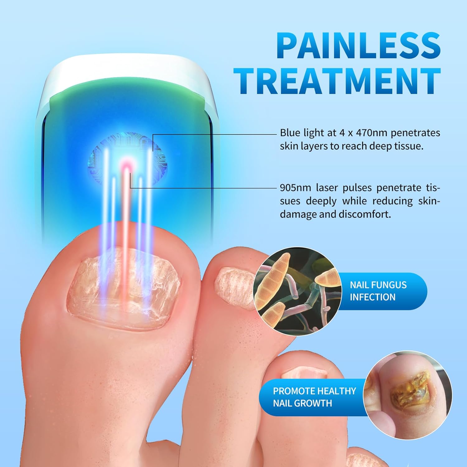 - ✅【Effective Nail Fungus Treatment】: Toe nail fungus laser treatment device is specially developed for nail fungal infections with 470nm blue laser and 910nm invisible laser live treatment can effectively penetrate deep into the nail bed to reach the tissue area where the fungus colonies are reproducing, and control the temperature of the nail surface at 43-51℃, so that the fungus loses the ability to reproduce,resulting in fungal thermal damage,Restore its normal nail shape.