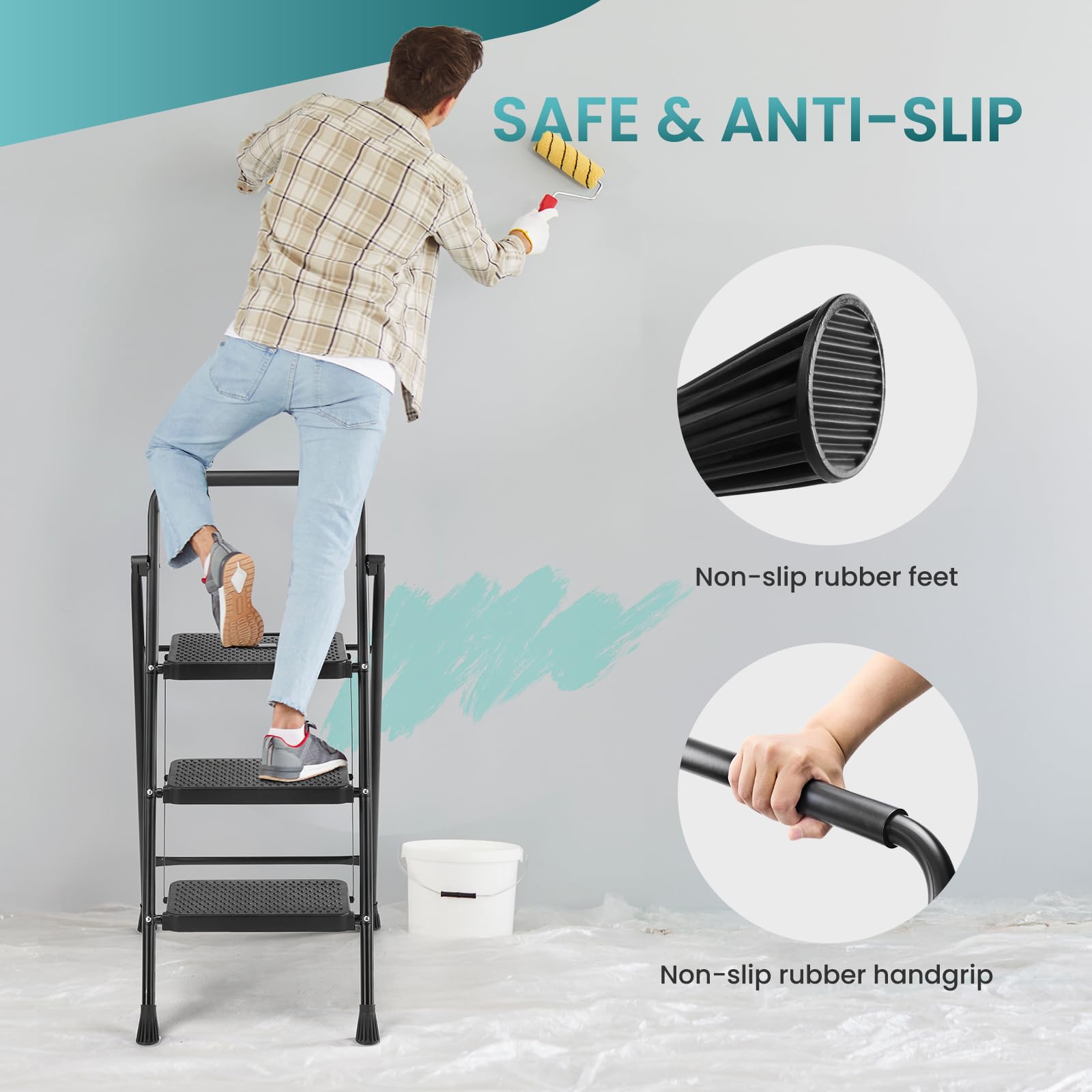 - [Anti-Slip Design]Designed for comfort and security,step ladder 3 step folding comes with a soft rubber handgrip for easy carrying and a secure hold. The thickened anti-slip feet keep the ladder firmly in place on surfaces, giving you confidence and stability during use.
