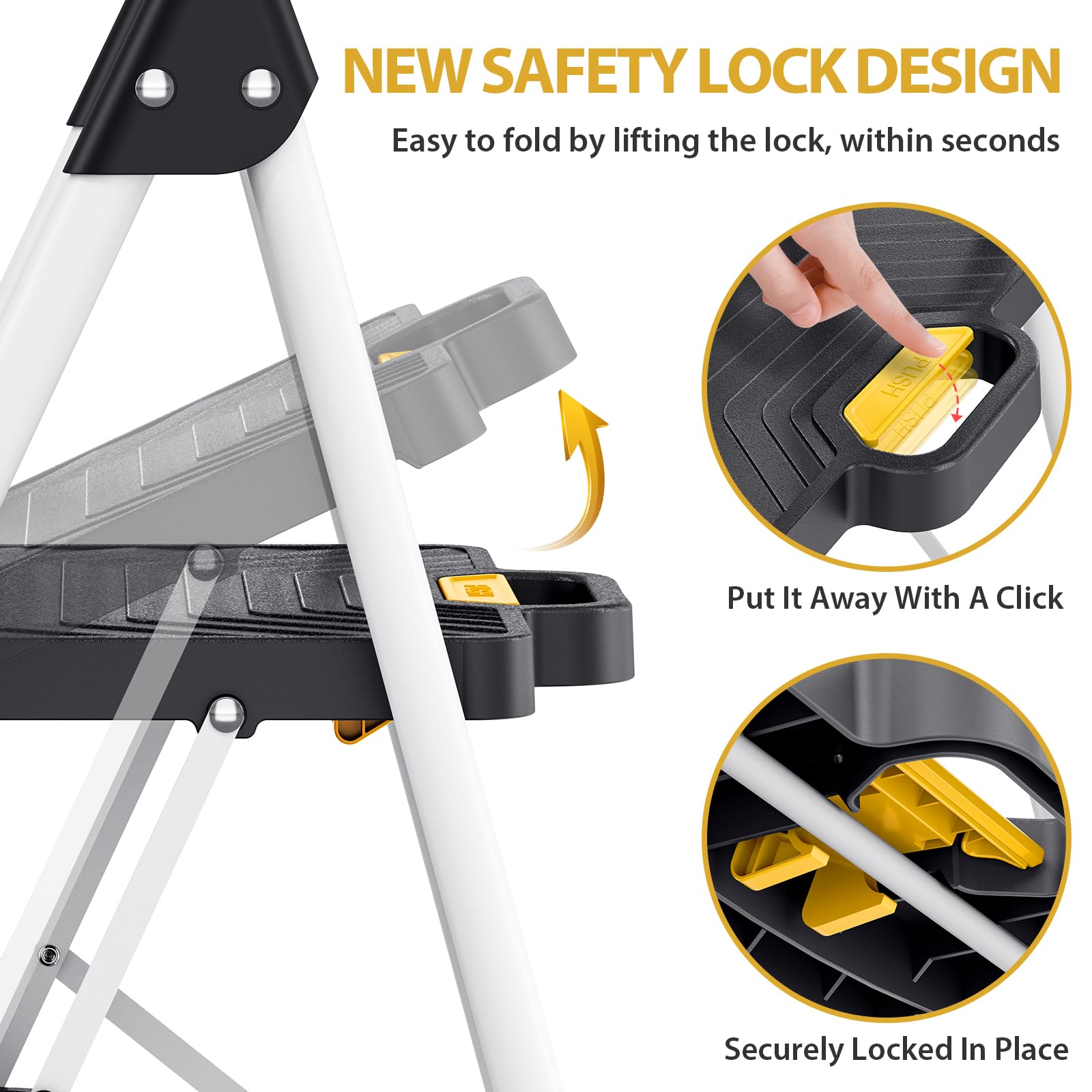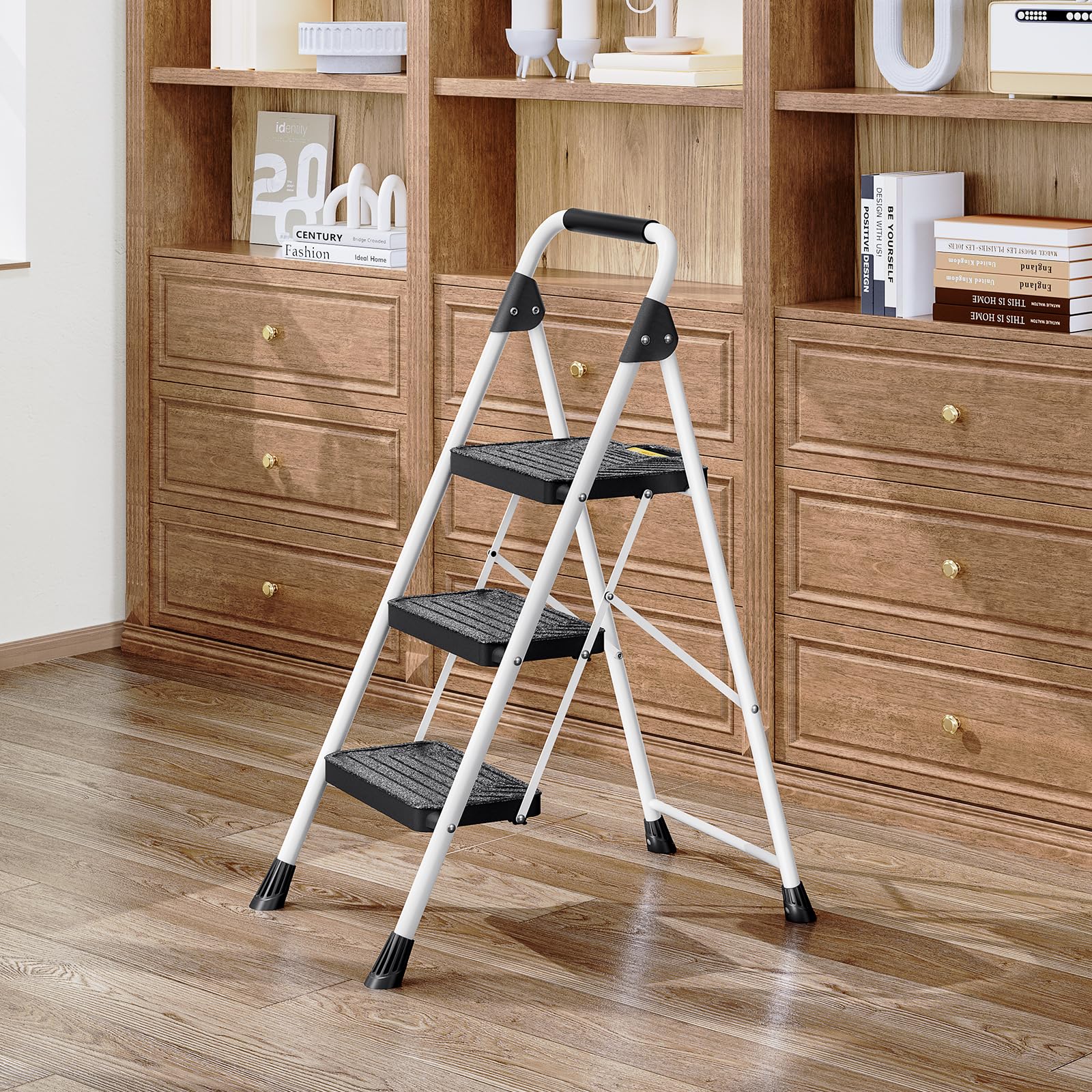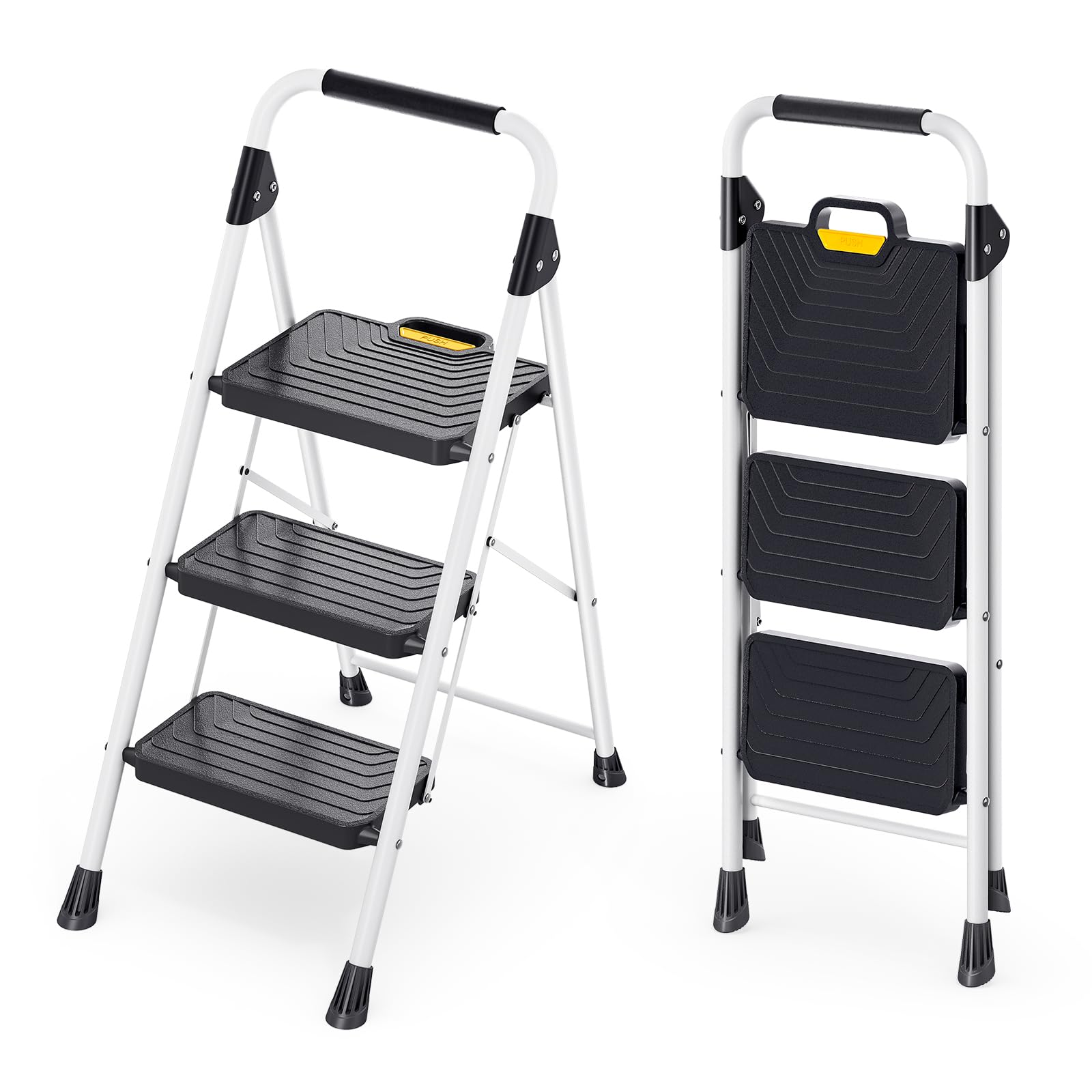 Sturdy Steel 3 Step Ladder, Folding Step Stool with Handrail, Anti-Slip Wide Pedals, Safe-Lock Design, Pass 800lbs Load Testing, Portable Ladder for Multi-Purpose in Home, Kitchen, White