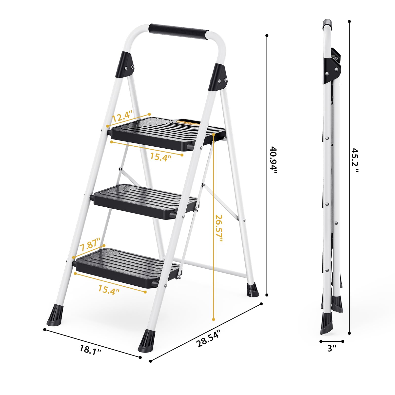 - Heavy-Duty Construction: This 3-step ladder is built with a high-strength steel frame, ensuring exceptional durability and stability, with a maximum load capacity of 800 lbs, making it suitable for various tasks. Open dimensions: 18.1"L * 28.54"W * 40.94"H, folded dimensions: 18.4"L * 3"W * 45.2"H
