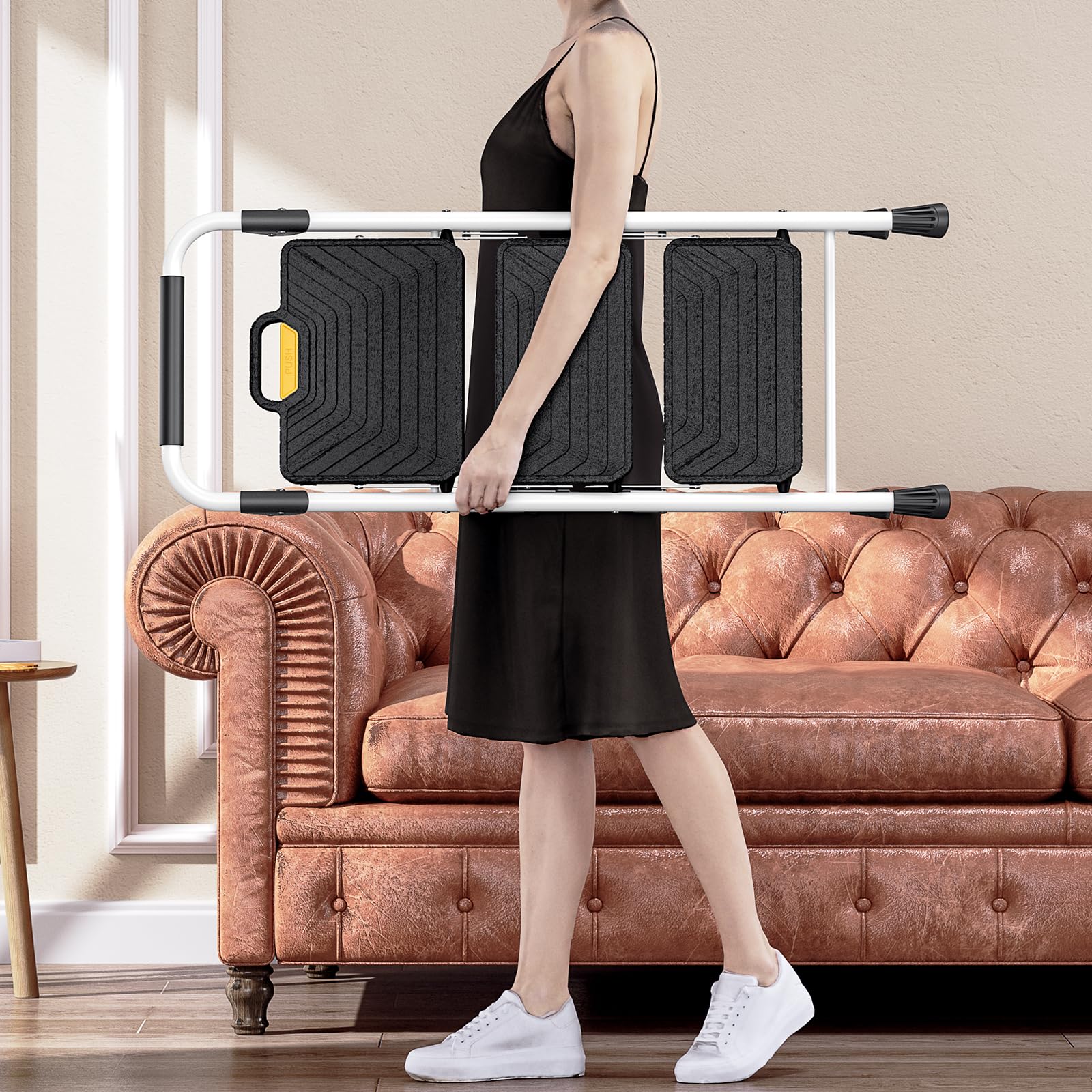 - Compact and Portable Design: The ladder folds down to a slim profile, allowing for easy storage in tight spaces such as closets or under beds, and its lightweight construction enables effortless transportation with one hand