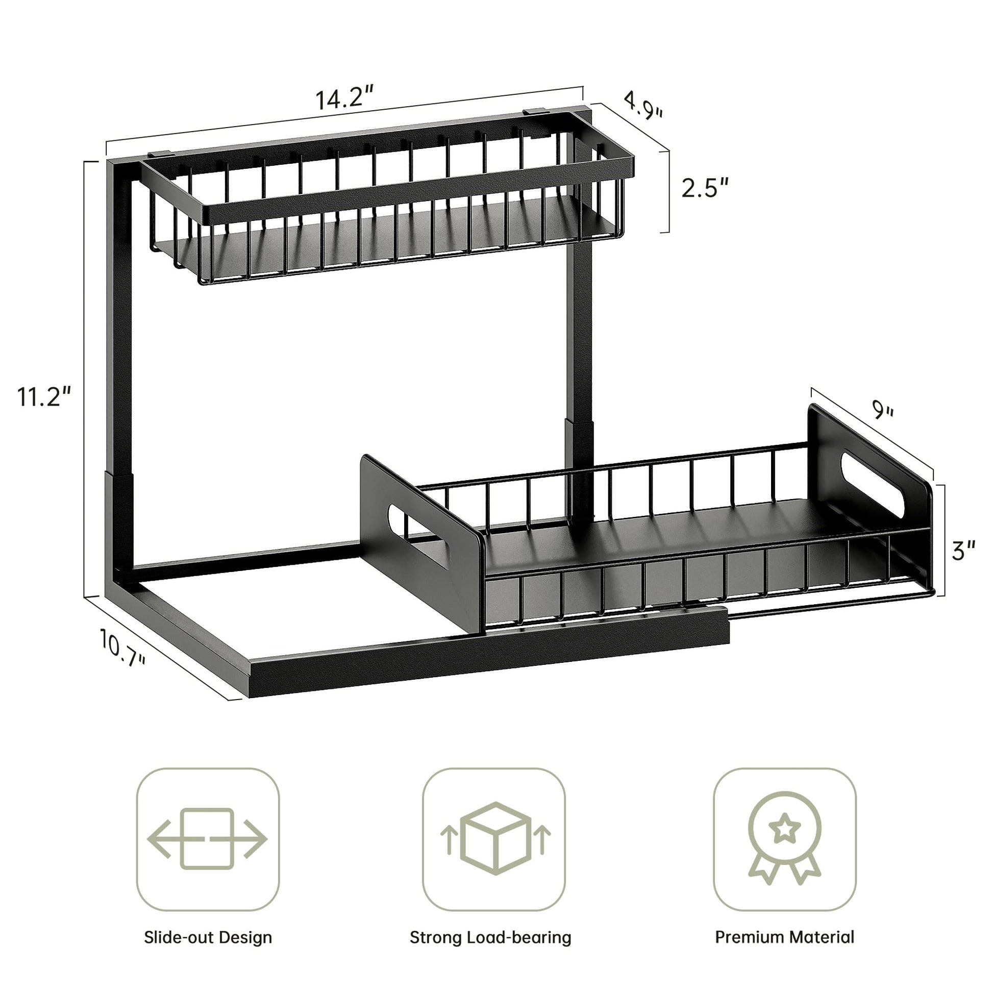 - Pull-out Storage Drawer: Kitchen sink organizer has a sliding drawer with handles on the bottom that pulls out smoothly for easy access to your bottom stored items. The bottom shelf can hold items up to 8.4" in height.